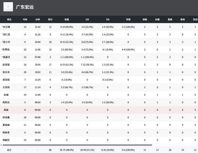 广东宏远青年队此役5人得分上双,刘卫霖12分5篮板5助攻,徐小华18分3篮板3助攻,吾赞依尔10分2篮板2助攻,赵昱锟17分8篮板,张天净11分,谈仁凯11投4中,只拿到9分3篮板8助攻。