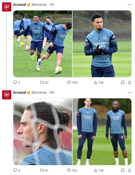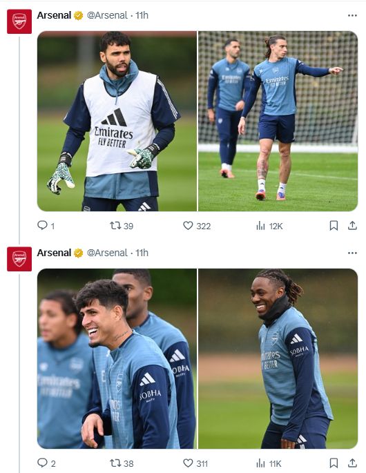 有眼尖的球迷发现,这些训练照中缺少了关键人物萨卡的身影。主帅阿尔特塔赛前透露加布里埃尔有伤在身,因此训练照中也没有加布里埃尔,但萨卡的情况无人提及,他的缺席引发了球迷们的担忧。